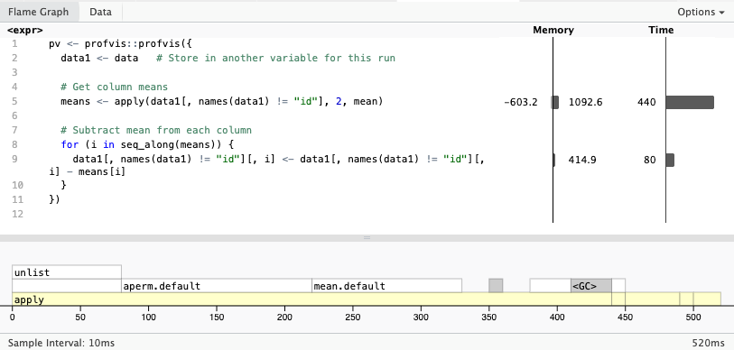 install.packages("profvis")Then, you can use it to profile your R code like this:
